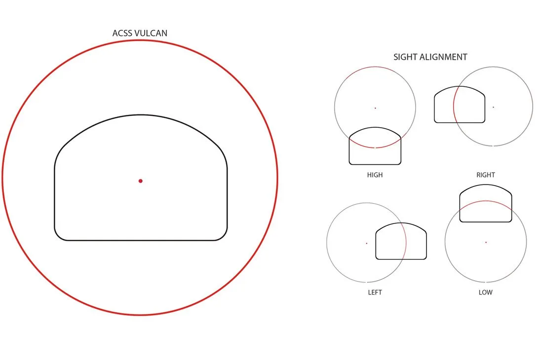 This model includes the Red Dot Bright® ACSS® Vulcan® Dot reticle—a centre aiming point surrounded by a large outer reference circle that extends beyond the visible window. This circle provides instant visual feedback to help users quickly centre the dot, greatly improving sight recovery and reticle acquisition under pressure.